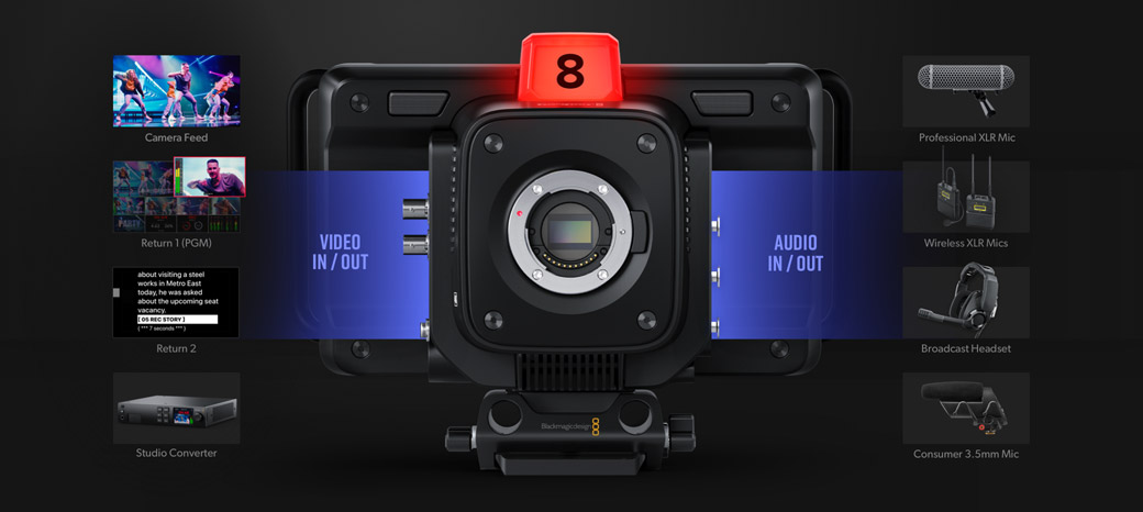 The Blackmagic Design Studio Camera 4K Pro is a compact and lightweight broadcast camera designed for live production and provides a variety of options to record and broadcast your video. New features include a lighter carbon fibre body, up to 25,600 ISO, 13 stops of dynamic range, a bigger tally light, HDMI output with camera control, 12G-SDI input and output, talkback within SDI, two USB Type-C ports for recording and control, a standard 5-pin broadcast headset jack, a speaker, built-in dual microphones, a 7 Inch HDR LCD, a redesigned sun hood, and 10G Ethernet.